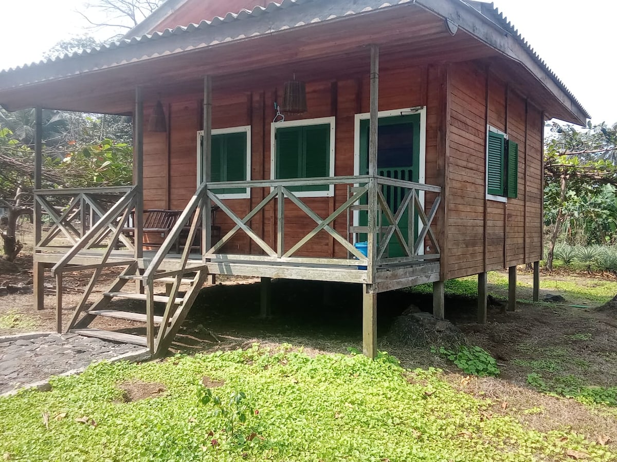 Refugi únic a Praia Jalé, un dels més bonics i naturals de São Tomé. Es troba a la zona de protecció del Parc Natural d'Obô, a l'illa de São Tomé. A pocs passos del mar, el nostre bungalou familiar ofereix unes vistes impressionants de l'oceà i el so relaxant de les ones. Amb capacitat per a 2 a 5 persones (preu base per a 5; posa't en contacte amb nosaltres per ajustar-lo), inclou esmorzar i wifi. Ideal per a parelles, famílies o grups que busquen tranquil·litat en plena natura.