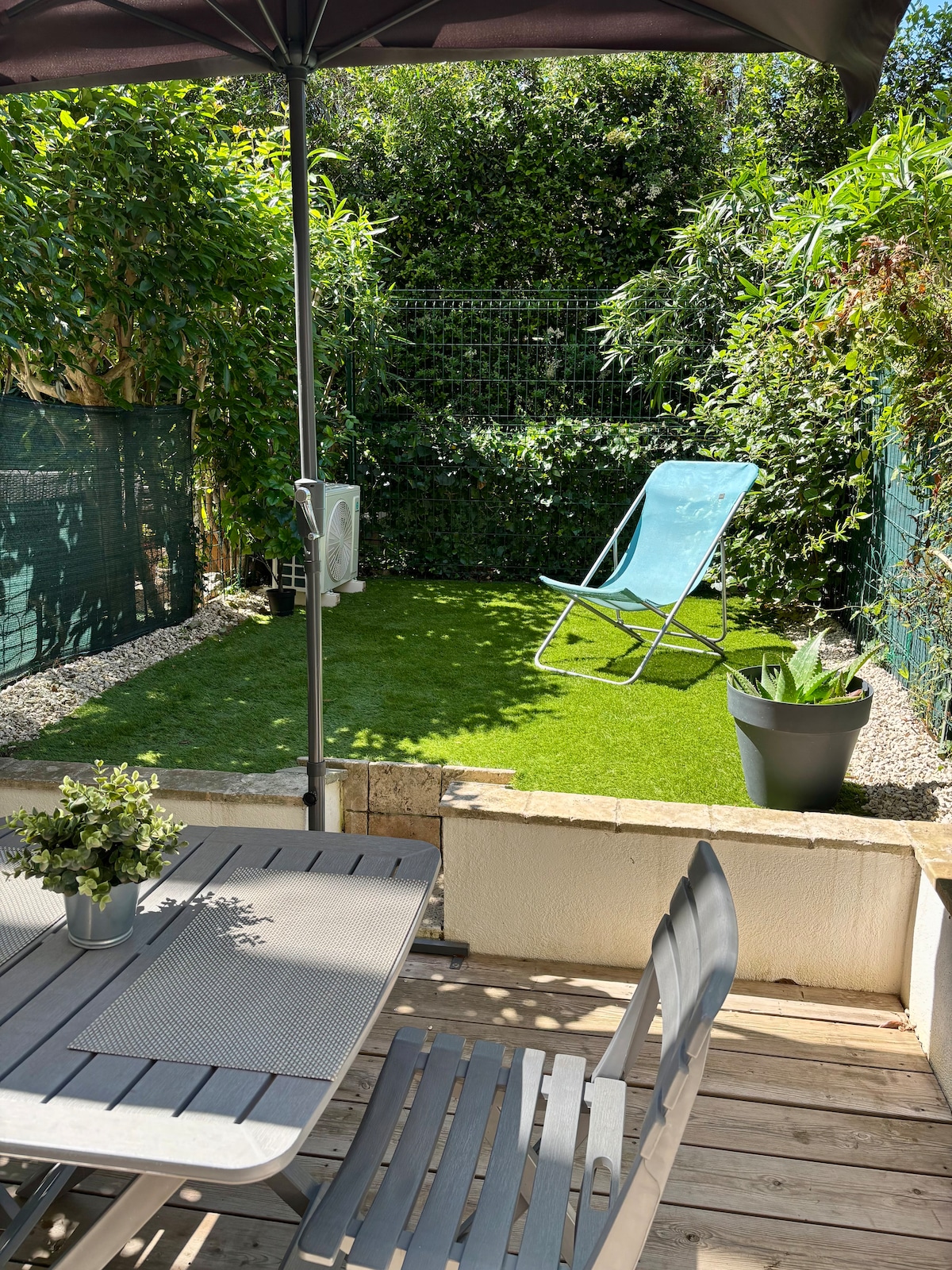 Lluminós apartament de 2 habitacions amb aire condicionat (62 m²) amb terrassa, jardí privat i vistes al mar, a només 100 m de la platja! Totalment equipat i còmode, amb aparcament privat segur. Ideal per a famílies amb nens petits, dues parelles o per treballar a distància (inclou un espai de treball). La teva acollidora segona llar a Cavalaire-sur-Mer! 🌞