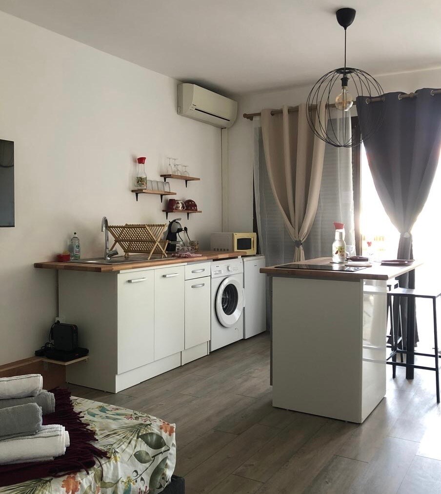 Pis nou i acollidor amb aire condicionat i relaxa't en un llit de matrimoni amb televisor i un gran sofà llit amb televisor de 65 polzades. A prop del poble, de l'aeroport, un gran centre comercial a 20 minuts. La terrassa de 15 m2 per a fumadors amb banyera d'hidromassatge per a 2 a 4 persones i 2 aparcaments . La nit per a 4 persones / mín. 1 nit. Preus setmanals o mensuals decreixents. L'arribada és entre les 13:00 i les 21:00 i la sortida entre les 6:00 i les 11:00. L'entrada i la sortida són autònomes i disposen d'una caixa de claus. Estem classificats de 3 estrelles.