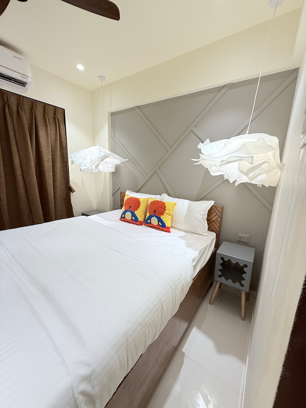 Aquest apartament de luxe 3BHK ofereix la barreja perfecta d'espai, estil i comoditat. Dissenyat amb interiors elegants, cada dormitori té una mida generosa amb llits suaus, un ampli emmagatzematge i molta llum natural. La moderna sala d'estar és perfecta per relaxar-se o entretenir-se, mentre que la cuina totalment equipada et permet preparar qualsevol cosa, des d'un esmorzar ràpid fins a un sopar complet. Situat en un barri elegant amb fàcil accés a restaurants, botigues i trànsit, la teva estada perfecta comença aquí.