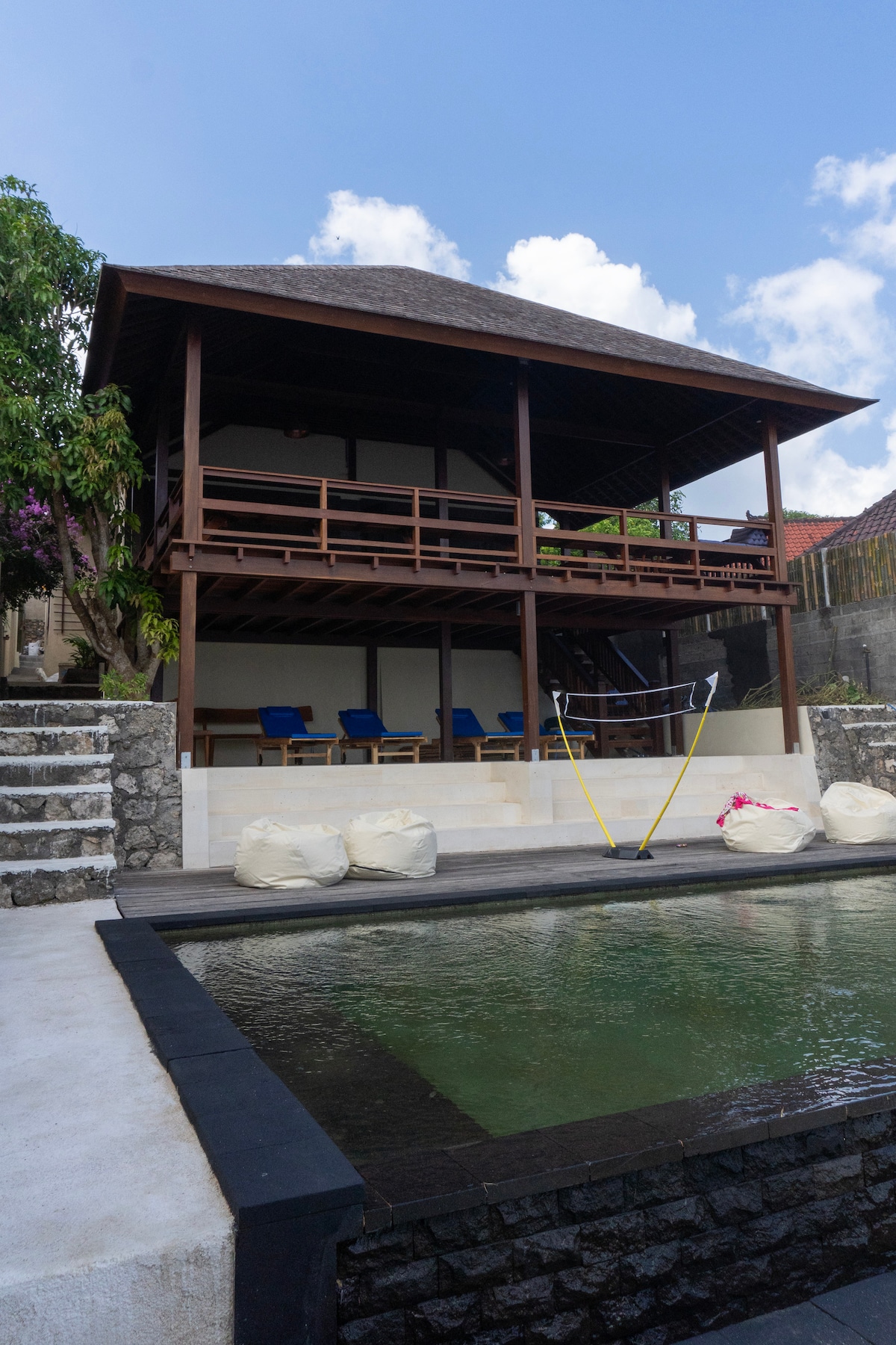 Vil·la privada absoluta davant del mar a Nusa Lembongan amb unes vistes impressionants del surf i de la muntanya Agung. Perfectament situat a pocs metres dels millors bars i restaurants de les illes. A poca distància a peu de la platja de natació. Piscina privada. La millor ubicació de l'illa! directament al camí principal: esglaons mínims per pujar - Aigua potable gratuïta - WIFI - Aire condicionat - Caixa de seguretat - Minibar: sala d'estar amb televisió i pel·lícules. - Massatges a petició a la piscina durant 200 000 - lloguer d'escúters - vigilant nocturn