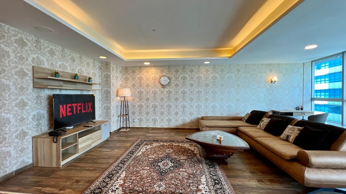 Entra als apartaments Flamingo Grand de 3 dormitoris, els apartaments de servei més sofisticats i estèticament emocionants d'Islamabad. Gaudeix d'una experiència segura i elegant en aquest espai cèntric. Tant si viatges per plaer com per motius de feina, ens assegurem a Flamingo per oferir-te una experiència de 5 estrelles. Els hostes també gaudeixen d'una plaça d'aparcament gratuïta i segura, wifi gratuït i experiència veient la seva sèrie de televisió preferida en el LED intel·ligent de 65 polzades.