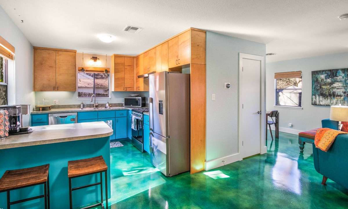 Aquesta és una caseta per a convidats moderna, còmoda i pràctica per passar una bona estona a East Austin. La nostra casita es pot caminar a molts dels llocs més populars d'Austin, com ara el Moody Center: el local de música més gran d'Austin. Construïda el 2020, la nostra casa d'hostes disposa d'un llit alt de matrimoni, un sofà amb un matalàs doble extraïble, una elegant dutxa a peu, un televisor intel·ligent i petits electrodomèstics que inclouen nevera-congelador, microones i cafetera Nespresso. Relaxa't amb estil mentre explores la nostra divertida ciutat!