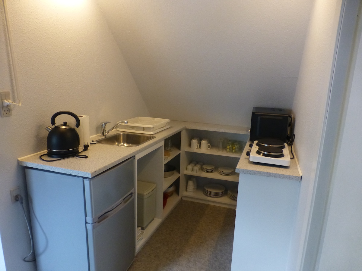 "The Old Living Room" és un petit pis, situat en un edifici lateral per al nostre propi allotjament. El loft és baix i l'allotjament apareix molt originalment, però amb comoditats comunes com ara calefacció, estufa elèctrica, nevera, televisor (cromecast) i dutxa, etc. Jardí privat i apartat, orientat al sud, amb graella de gas i mobles de jardí. Davant del pati hi ha accés a una gran zona de camp/llit. Opti per a 2 persones, però pots ser 4. No obstant això, un dormitori és una sala de passeig