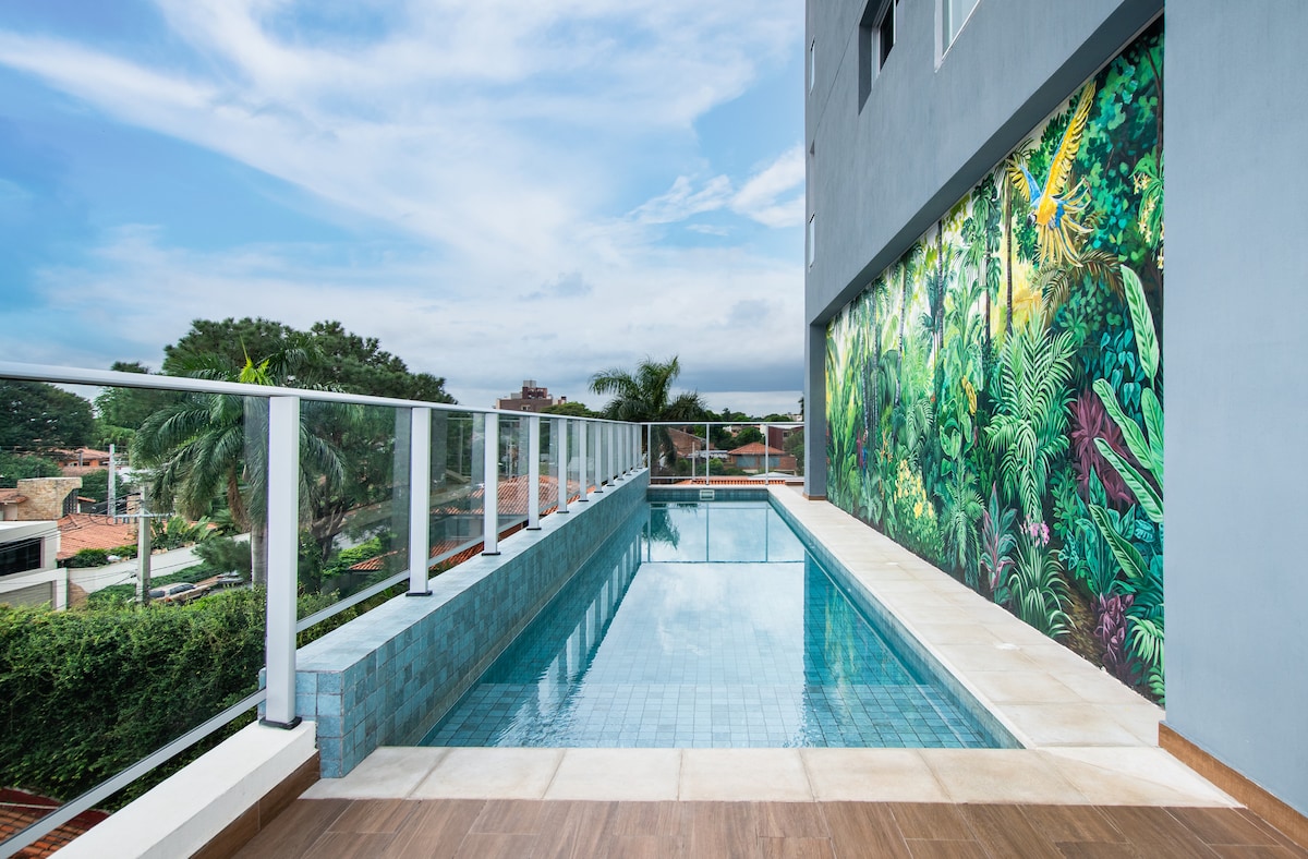 Gaudeix del nostre apartament modern a la zona més exclusiva d'Asunción Relaxa't a la nostra lluminosa sala d'estar amb televisió per cable, prepara els teus àpats a la nostra cuina 100 % equipada, descansa al dormitori amb la seva pròpia televisió intel·ligent mentre estàs sempre connectat amb internet d'alta velocitat Gaudir de les vistes de la ciutat des del nostre ampli balcó mentre prens un cafè. Disposaràs d'un garatge privat, accés a una sauna, una piscina a la terrassa, una sala de reunions, un gimnàs i una sala d'esdeveniments amb graella.