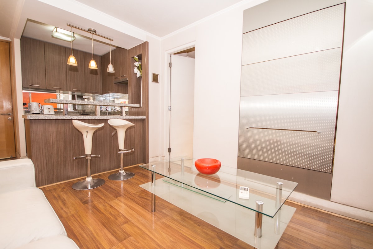 Gaudeix d’aquest pis espaiós i exclusiu a la comuna de Las Condes. Està a només 2 illes de l'estació de metro de Manquehue, a prop de restaurants, del centre comercial Parque Arauco, del centre comercial Alto Las Condes i d'Alonso de Córdova. Aquest pis d’1 dormitori i 1 bany és a la segona planta i disposa d’1 llit «king size», bany, cuina equipada, sala d’estar/menjador, terrassa gran, sofà (no reclinable), wifi i televisor perquè hi puguin allotjar-se 2-3 persones còmodament. Inclou tovalloles, sabó, xampú i condicionador. 1 aparcament, ascensor i conserge les 24 hores.