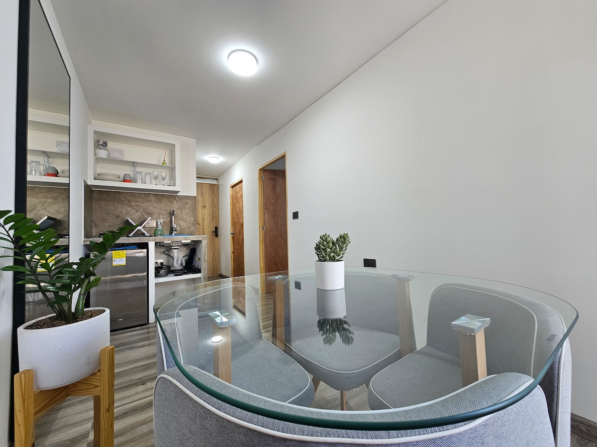 ** UNITAT EXCLUSIVA SENSE CÀRREC DE SERVEI D'AIRBNB ** Et donem la benvinguda al nostre luxós loft a Cali, inspirat en la natura. Amb 44 m² (474 peus quadrats), un jacuzzi privat a l'aire lliure i capacitat per a 2 persones, és un oasi contemporani. La sala d'estar, el menjador i la cuina equipada ofereixen comoditat i estil. Un dormitori privat i un bany complet et permetran gaudir d'un somni reparador. Una ubicació immillorable a prop d'atraccions turístiques.