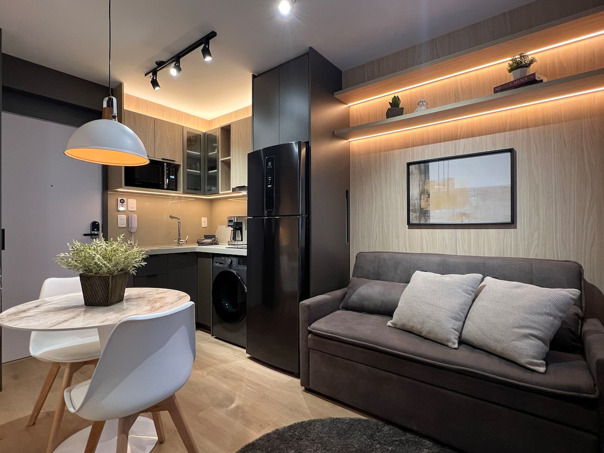 Modern studio condo in Rebouças, 5 min from Mercado Municipal, Shopping Estação, and near cafés and bars. Easy access: 10 min to the bus station, 25 min to the airport. AC + heating; gas water shower; co-working; 400 Mb Wi‑Fi + desk; queen bed with hotel‑style linens + blackout shades; equipped kitchen; smart TV streaming; 24 h self check‑in; laundry & gym in the building.