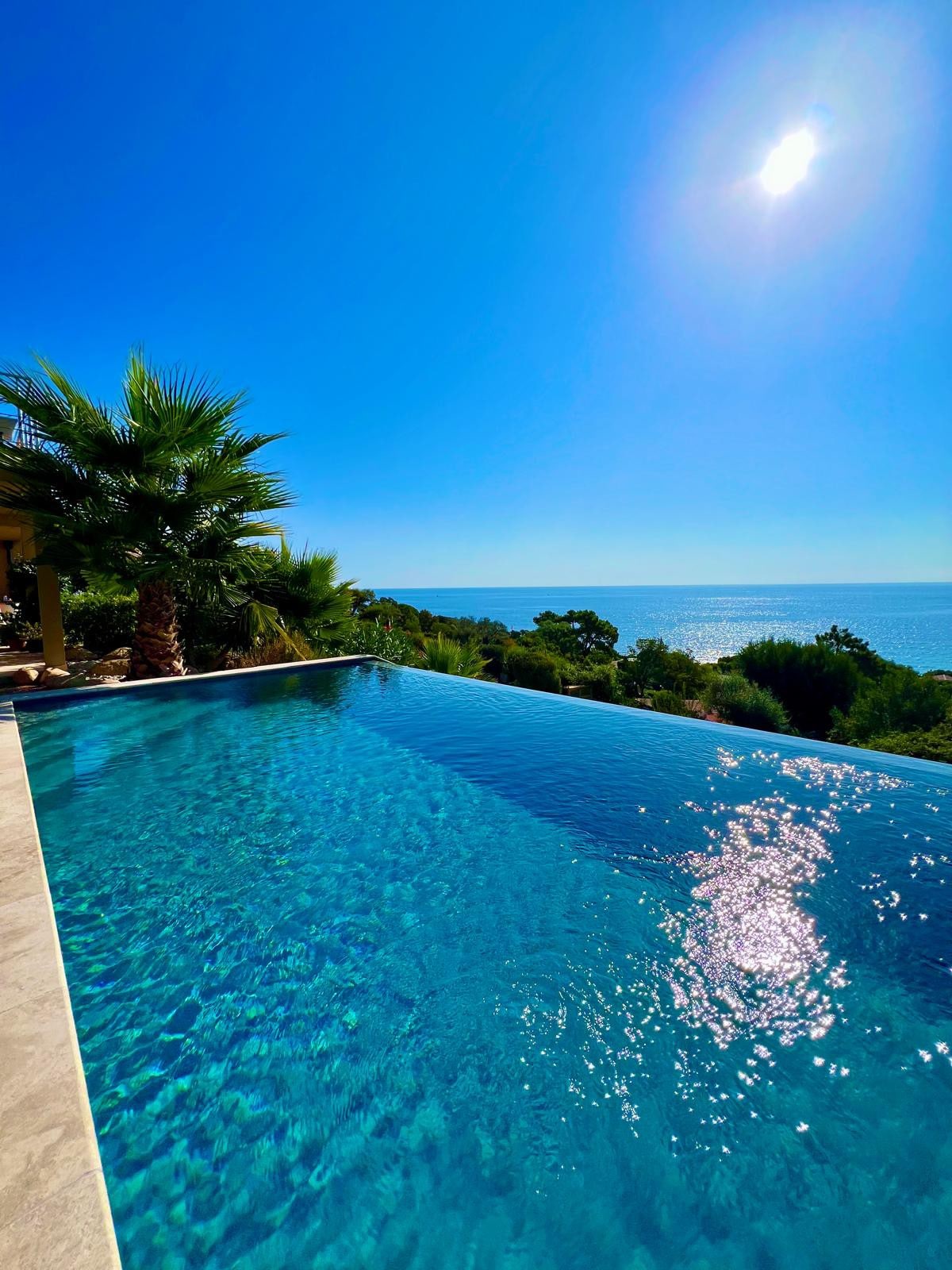 Notre studio 2-3 personnes de 35m2 est climatisé. Il est composé d'un grand espace très lumineux donnant sur une vue mer avec un lit 160x190, un coin dressing. un coin cuisine équipé, une salle de bain avec une grande douche à l’italienne, wc, lave linge. En descendant quelques marches en pierre, vous accèderez à la piscine de la résidence. Vous disposez d'une place de parking privée. il y a la possibilité d'ajouter un lit bébé ou un lit 90×190 pour un enfant.