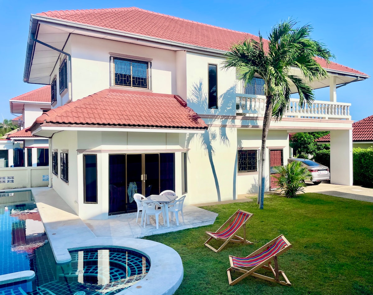Si t'agrada la teva casa de vacances privada i tranquil·la fins a la preciosa platja i una piscina de 50 metres de llarg davant de casa teva, aquesta és la casa de platja per a tu, Dar's Haven Cha-am :) terreny 75sqwa, espai habitable 280 metres quadrats, sala d'estar i menjador de sostre alt 5,5 m , 4 dormitoris 3 banys, inclosos tots els mobles, cuina, nevera i taula de menjador, sala d'estar, gimnàs, terrassa a la casa amb vistes al mar, piscina directa a la casa del davant.