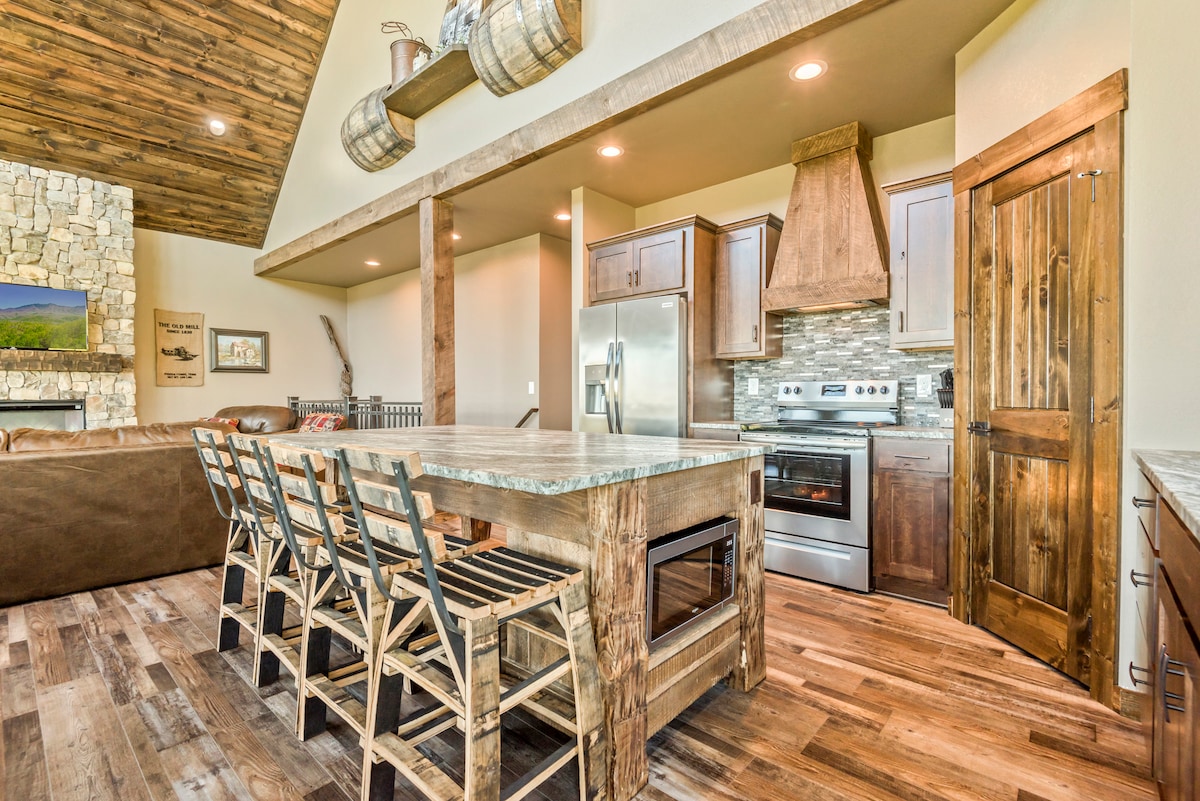 VISTES!!! A pocs minuts de tot, perfectament situat. Cabana de luxe personalitzada a la muntanya amb capacitat per a 14 persones, situada en una finca de més d'una hectàrea, amb més de 300 metres quadrats d'interior i diverses cobertes i patis amb vistes al centre de Gatlinburg i a les Great Smoky Mountains. Piscina interior climatitzada privada, banyera d'hidromassatge, sala de jocs amb piscina, jocs d'arcade, televisors i bar. Diverses llar de foc interiors, llits còmodes, cable Spectrum, cuina gourmet, wifi d'alta velocitat, bugaderia, aparcament i carreteres fàcils. Accés a piscines exteriors, pàdel, tennis i molt més