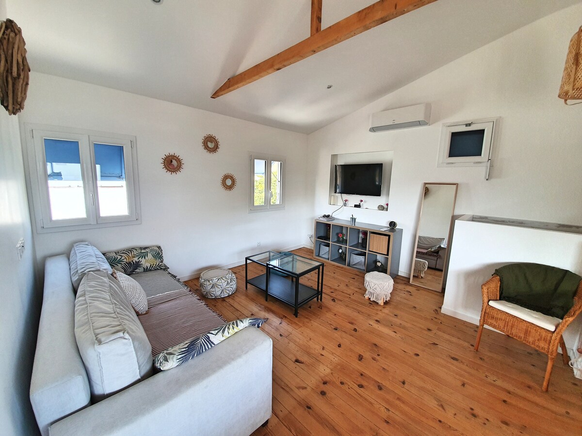 Bonic xalet reformat i ultracòmode situat a Plage des Chalets a Gruissan. La platja està a 80 metres a peu. 2 apartaments molt ben equipats i amb aire condicionat de 40 m² cadascun en lloguer junts o per separat. Cada pis té capacitat per a 4 persones amb 1 dormitori amb 1 llit doble independent i un sofà llit de 2 places. Gran terrassa amb vistes parcials al mar a la part superior i terrassa a la vegetació de la planta baixa. Totes les botigues, restaurants, bars, jocs infantils, pistes de petanca a poca distància a peu.