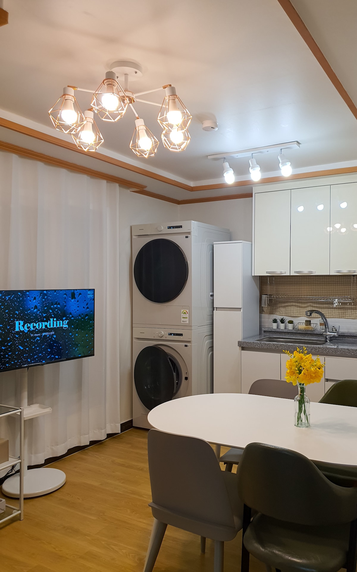 Una suite lluminosa d'un dormitori amb finestres grans i un escriptori espaiós, ideal per a viatgers de feina o per a aquells que els agrada la llum natural. Aquest espai tranquil inclou un bany amb un disseny únic, una cuina compacta amb tots els elements bàsics i un sofà llit acollidor per a un tercer hoste. Situat en un edifici històric de 1965 amb tocs de fusta i detalls coreans fets a mà, el pis ofereix una estada tranquil·la però connectada al cor de Seül, a pocs passos de Seosulla-gil i del Palau Changdeokgung.