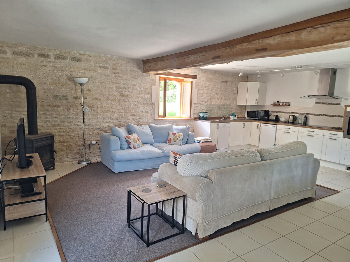 Paller de pedra reconvertit, al cor del bonic poble de Dampierre-sur-Boutonne. Amb botiga/bar/cafè del poble i castell a menys de 400 metres Una escapada romàntica encantadora per a 2 persones, ja que el dormitori té un llit «super king size», però hi poden dormir 4 persones si cal. Una àmplia zona d'estar, cuina i menjador, i una gran terrassa coberta amb barbacoa. La propietat té una piscina climatitzada preciosa (10 × 5 m) amb terrassa per prendre el sol i sofàs, un gran graner de jocs amb taula de billar, taula de ping-pong, futbolí i altres jocs, i una zona de gespa.
