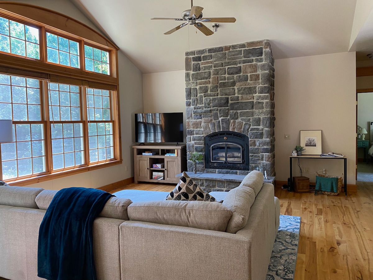 A great location, northside. A must see. Across the street from Mt McSauba nature preserve trails for hiking, 5 minute walk to Lake MI dunes with a beautiful beach & a 2 minute walk to watch the sunset. 2 miles from downtown. Wheelway Bike path & disc golf. Very cozy atmosphere with a fully equipped kitchen, bring your essential oils and relax in the jacuzzi tub, very comfortable beds, fold down couch and cot if needed , washer/dryer, relax by the wood fireplace Sept-May, Fire pit May-Sept