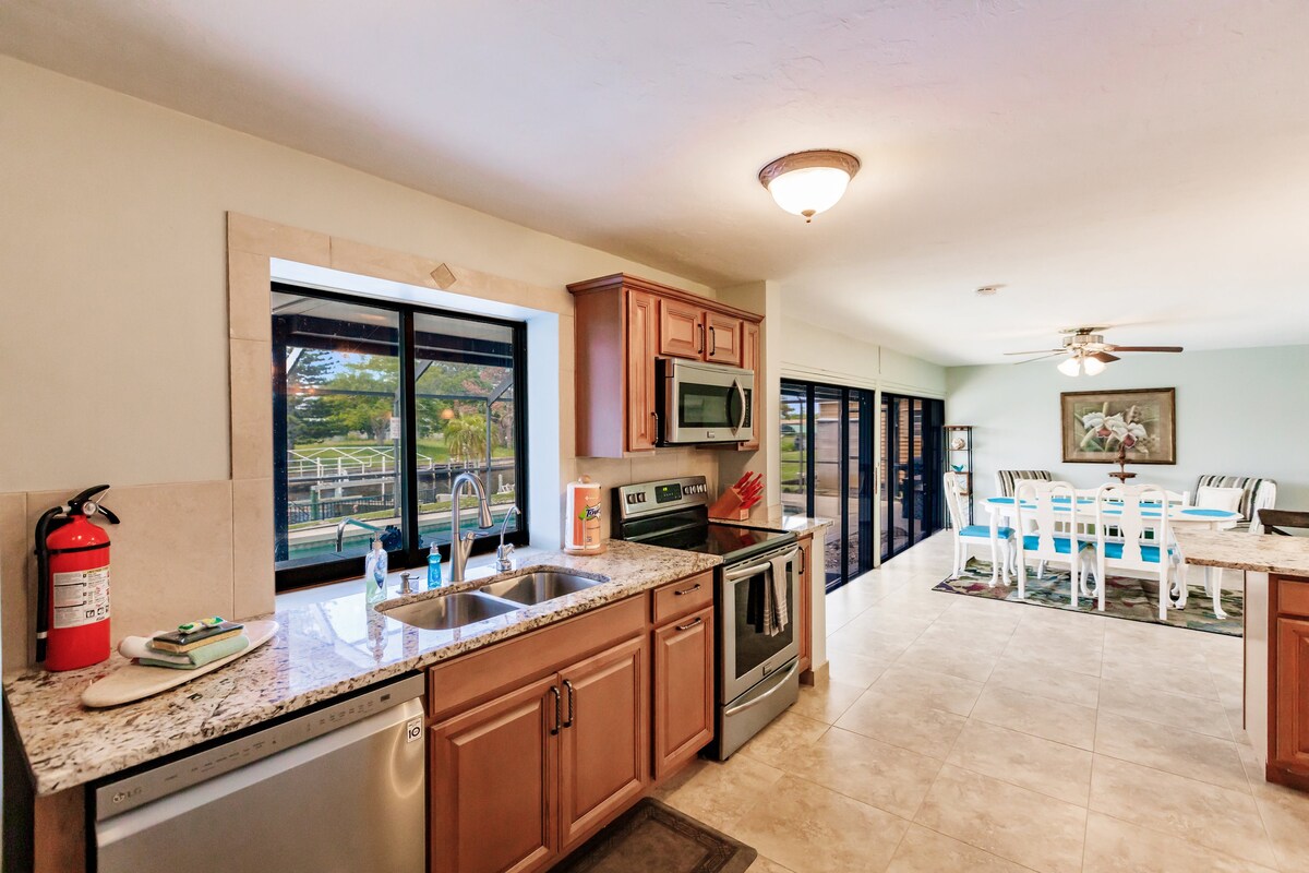 Capacitat per a 8 persones amb piscina privada climatitzada i vistes a l'aigua! A poca distància a peu o a 5 minuts en cotxe de Port Charlotte Beach Park! Aquest allotjament a la vora del mar, de 3 dormitoris i 2 banys complets és el millor! Piscina enorme amb lanai per nedar, flotar, fer una graella i relaxar-se. A pocs minuts de menjar, anar de compres, de tot! Wifi inclòs i 4 televisors per reproduir les teves pel·lícules preferides. Cuina completa. Rentadora/assecadora. A 30 minuts de les aigües termals, a menys de 5 de menjar, Fisherman's Village. A 15 minuts de PGD.