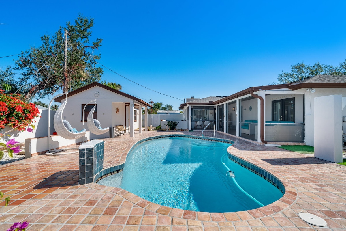 Relax in this family- and pet-friendly 3BR/2BA twin home featuring a heated saltwater pool, splash pads/tanning ledges and spa, fully screened-in for comfort. Large fenced yard, smart TVs with streaming, and no pet fee. The pool and backyard and side yard are private for guests, while your friendly hosts are next door. Hosts DO NOT use the pool while hosting guests. Close to Fort Myers Beach, Bonita Beach, Sanibel, and top local restaurants — perfect for families, kids, and pets!