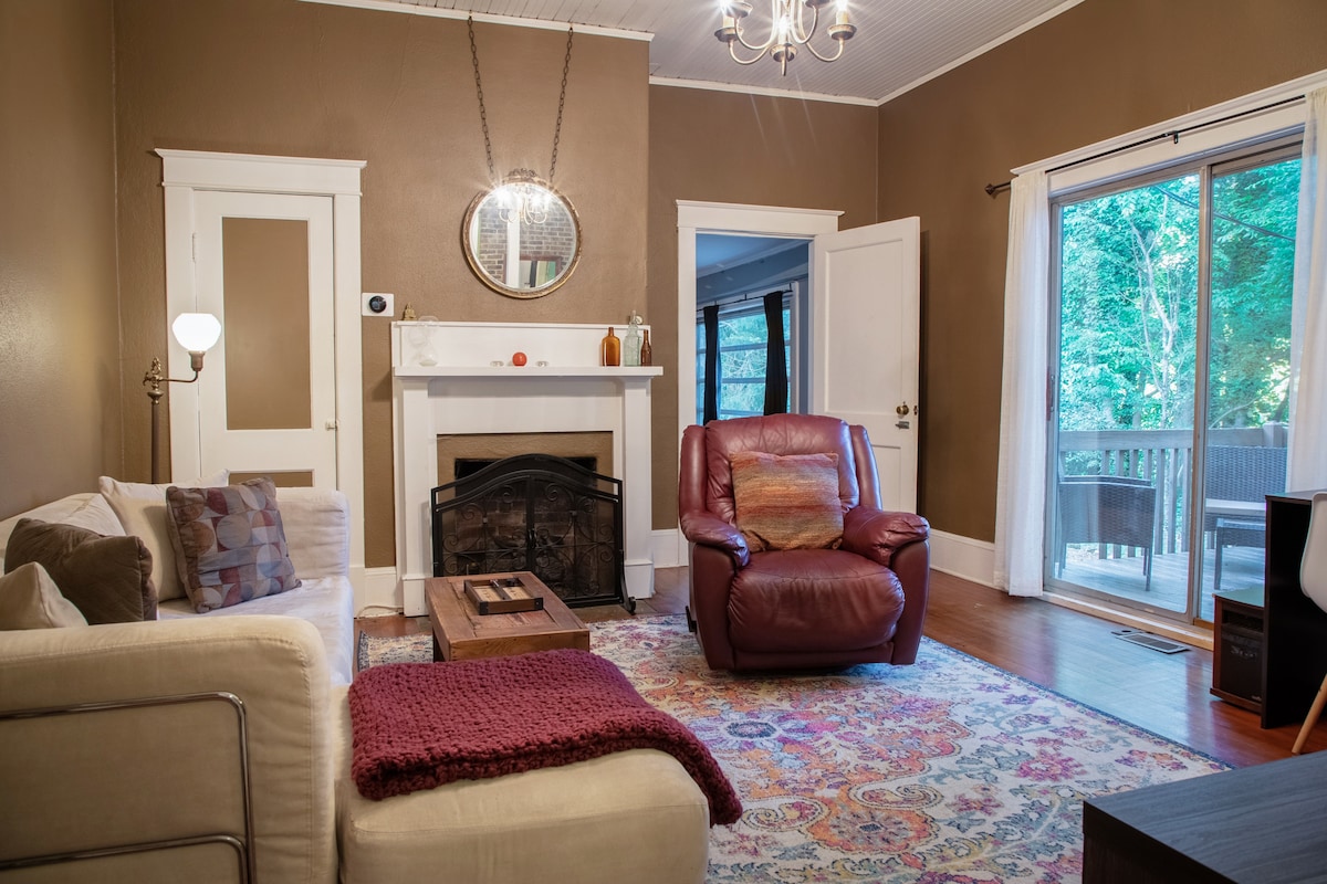Escapa't a la tranquil·litat en aquest encantador oasi de mig acre al costat d'un meravellós parc estatal i a pocs minuts dels llocs de moda locals. Gaudeix del te als porxos amb vistes als exuberants jardins. Relaxa't sota l'ombra clapada del roure. Entra als terres de fusta originals, una cuina moderna, llits acollidors i tocs artístics a tot arreu. Tant si viatges sol com amb els teus éssers estimats, aquest refugi únic a Bynum Village et farà sentir en pau. Passeja per la riba del riu o per la ciutat i deixa que els corrents et calmin l'ànima.