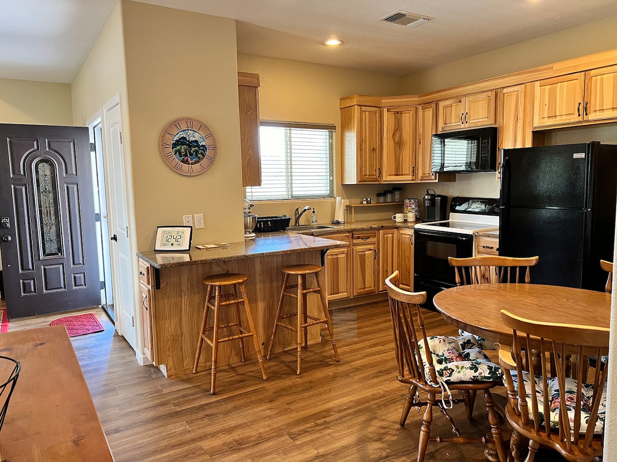 Take a break and unwind at this peaceful oasis as you come to explore all things "alien". Less than 2 miles to downtown, shopping, museums, dog park and walking trail. Explore Bitter Lakes Wildlife Refuge less than 7 miles away. This cozy living space offers a secluded home with two bed rooms, a full kitchen and 1.5 bathroom, and free parking on site.