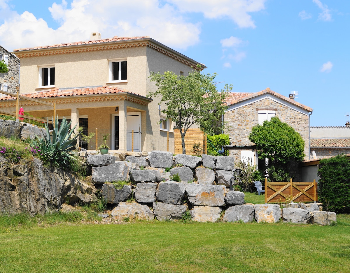Casa rural de pedra amb encant, amb aire condicionat i xarxa de fibra wifi. Jardí florit i boscós. Piscina, hort amb fruites de temporada ( pomes, cireres, quince)... Terrassa a l'ombra, amb foguera i piscina adjunta. Accés privat al bosc proper per sortir a peu. Zona de relaxació amb jocs a l'aire lliure disponibles ..ping pong, molkky mikado gegant, petanca, ..Per als atletes, per l'Ardeche, barranquisme i tennis a prop . Les despeses de neteja inclouen llençols i tovalloles per a 6 persones