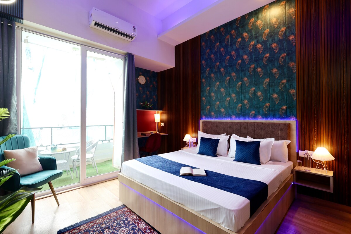 ✨ Estudi de luxe amb vistes a l'horitzó | Planta alta | Balcó | Prime Noida Desperta a dalt de tot de la ciutat en aquest elegant estudi, dissenyat amb cura per als hostes que valoren la comoditat, la privacitat i una experiència de primera. Situat en una de les torres més sol·licitades de Noida, aquest espai ofereix unes vistes precioses, un balcó privat i uns interiors amb la qualitat d'un hotel, perfectes per a viatges de negocis, per a parelles i per a estades llargues o curtes.