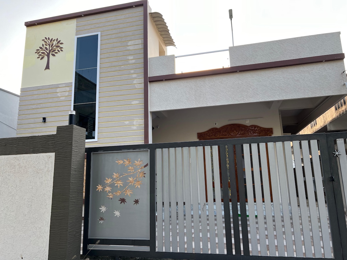 This entire 2 BHK first floor house for a comfortable stay upto 8 Member family. All basic amenties are available including Gas stove, Utensils and Fridge is available for a simple home stay. Out of 2 bedrooms , only one bed room has Geyser and AC. However both bedrooms have attached bathrooms and 5*6 size cots. bedsheets and Toiletries need to be brought by Guests. There is charging point for EV vehicles This is a quiet and secluded place away from city hustle and yet just 3 KM from center