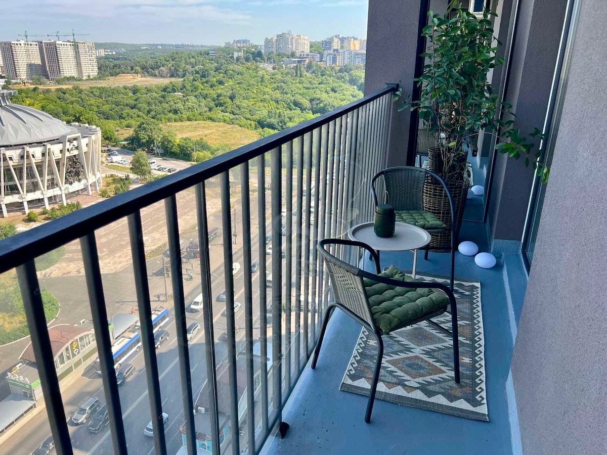 Wake up above the city! Enjoy panoramic views of central Chișinău from your private rooftop balcony in this modern designer penthouse. High ceilings (up to 5 m), separate bedroom, mezzanine office with extra bed, spacious living room opening onto a terrace, fully equipped kitchen, wardrobe, and bathroom. Balcony surrounds the apartment. Wi-Fi, 2 Smart TVs, air conditioning, workspace, washing machine and dryer included. Perfect for couples, business trips, or a stylish city stay.