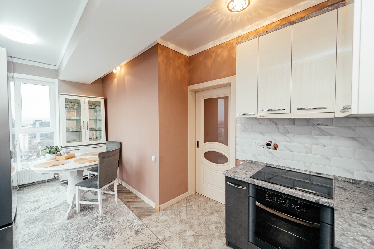 Un apartament modern d'1 dormitori en un edifici nou al centre de Chisinau. Situat a la planta 8 amb ascensor. Calefacció autònoma, aire condicionat, wifi, televisor, rentadora, assecador de cabells, planxa. Dutxa, tovalloles netes i articles bàsics. Cuina amb vistes panoràmiques, fogons, forn, microones, nevera, plats, te i cafè. A prop hi ha cafeteries, botigues i atraccions.