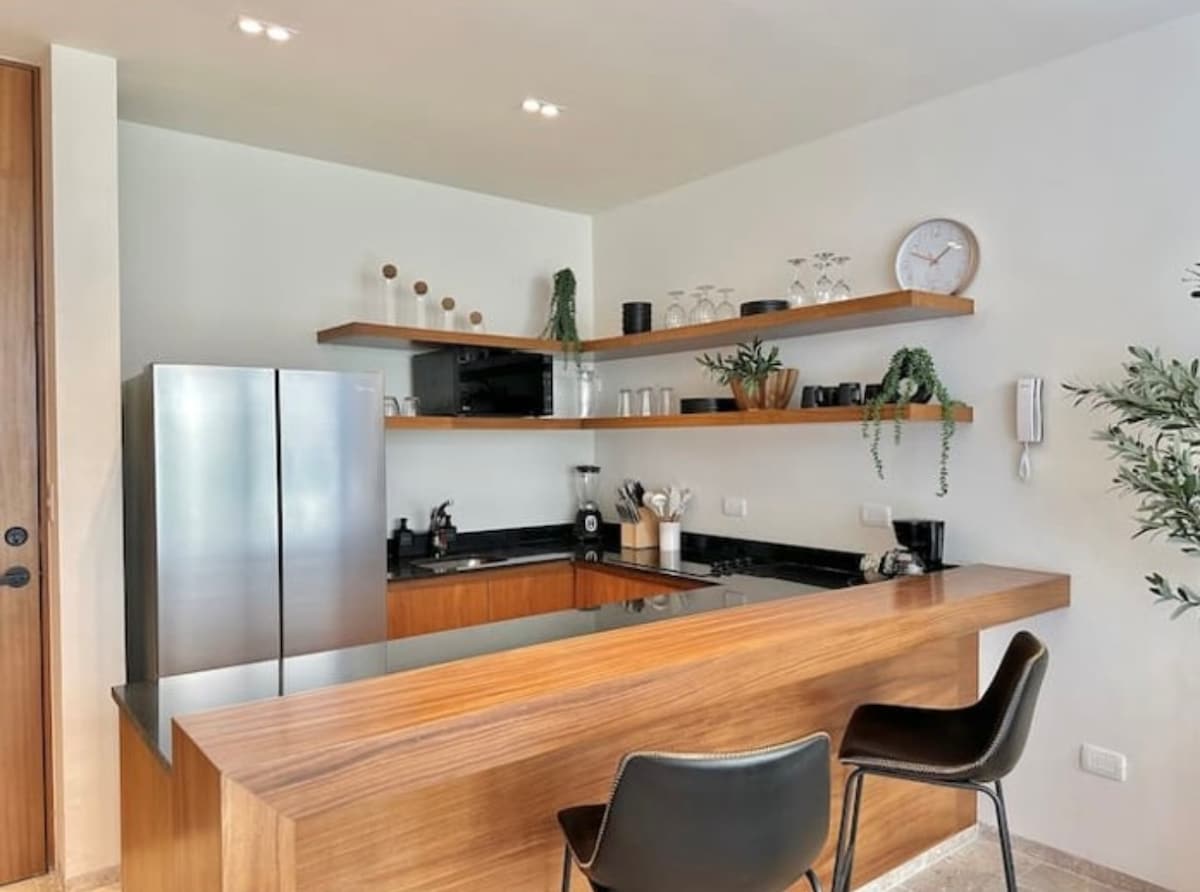 Et donem la benvinguda al teu refugi a Temozón Nord, una de les zones de més ràpid creixement de Mèrida, que encara conserva la tranquil·litat i l'entorn natural. El nostre apartament d'un dormitori és ideal per relaxar-se i gaudir: té un llit «king size», armari, bany privat i un còmode sofà llit doble a la sala d'estar per a hostes addicionals. Gaudeix de la teva pròpia piscina privada a la terrassa o aprofita les comoditats de l'edifici, com ara el gimnàs, la piscina comuna, el parc per a animals de companyia i la sala d'esdeveniments.