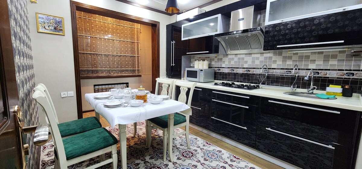 Benvingut a un acollidor i elegant estudi de 30 m², que va ser el taller d'art del pintor Gayrat Baymatov. L'apartament està situat en un edifici únic, on els artistes encara viuen i creen a cada pis. A només 5 minuts a peu trobaràs: • Estació de metro Buyuk Ipak Yuli • Un mercat local amb fruites fresques, verdures i cafeteries familiars • Pizzeria Belissimo • «Breadly» serveix esmorzars deliciosos No hi ha cortines a les finestres grans (com es mostra a les fotos).