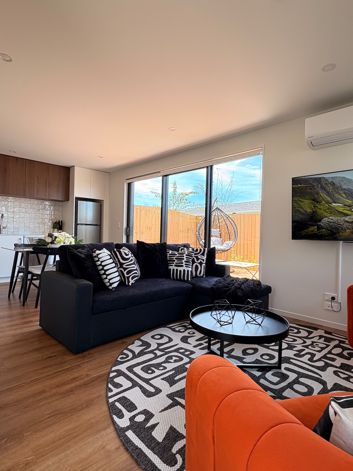 Aquesta impressionant casa unifamiliar nova es troba al centre de Christchurch, a només vuit minuts a peu del parc infantil Margaret Mahy i a uns 10 minuts del districte financer. Els hostes tenen la seva pròpia entrada privada i l'ús d'una cuina totalment equipada, rentadora /assecadora, tenda de roba, bany , vàter bidè japonès, zona exterior moblada, un dormitori amb un llit «queen size» i un sofà llit al saló.