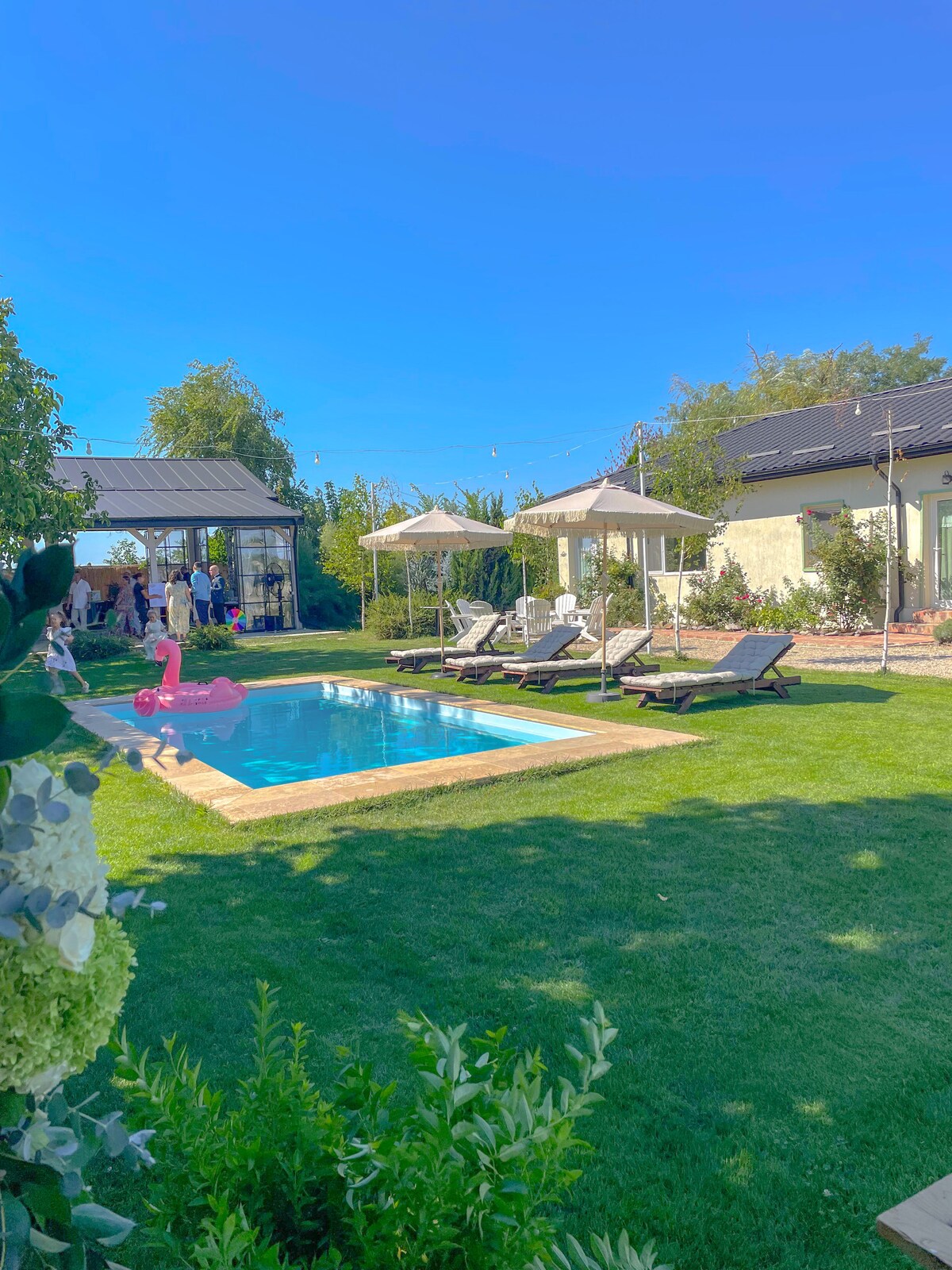 S'accedeix fàcilment al nostre jardí des de la carretera nacional 1(DN1) a Ciolpani. La piscina és de 6x3x1,5 metres, el cenador gran té 110 metres quadrats i pot allotjar fins a 64 persones en cadires i taules, deixant prou espai per ballar i col·locar el menjar a l'interior en cas de mal temps. El preu que es mostra aquí és per a l'allotjament de grups petits de fins a 20 persones, incloent-hi l'allotjament de fins a 8 persones. Per a grups més grans, envieu informació sobre el nombre de persones com a sol·licitud. Les festes han d'acabar a les 12 de la nit.