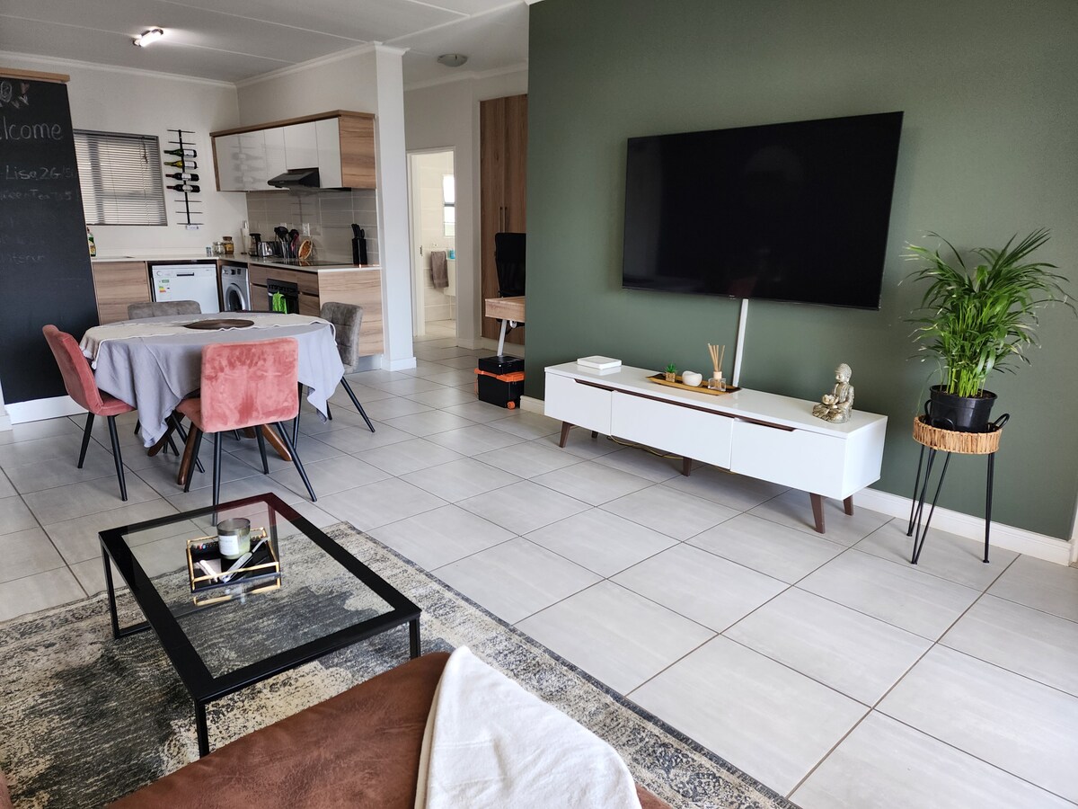 Pis executiu modern, totalment moblat, segur i tranquil al cor de Melrose Arch. És l'escapada perfecta a la ciutat i és adequada tant per a viatges d'oci com de negocis. Internet de fibra sense límits, un entorn segur i tranquil, un inversor automàtic, un televisor de 82"(saló) i un televisor de 37" (dormitori), tots dos intel·ligents. Convenientment situat dins del recinte comercial Melrose Arch amb accés a totes les botigues i restaurants. Generador de reserva a l'edifici, aparcament segur i protegit amb seguretat les 24 hores 😊