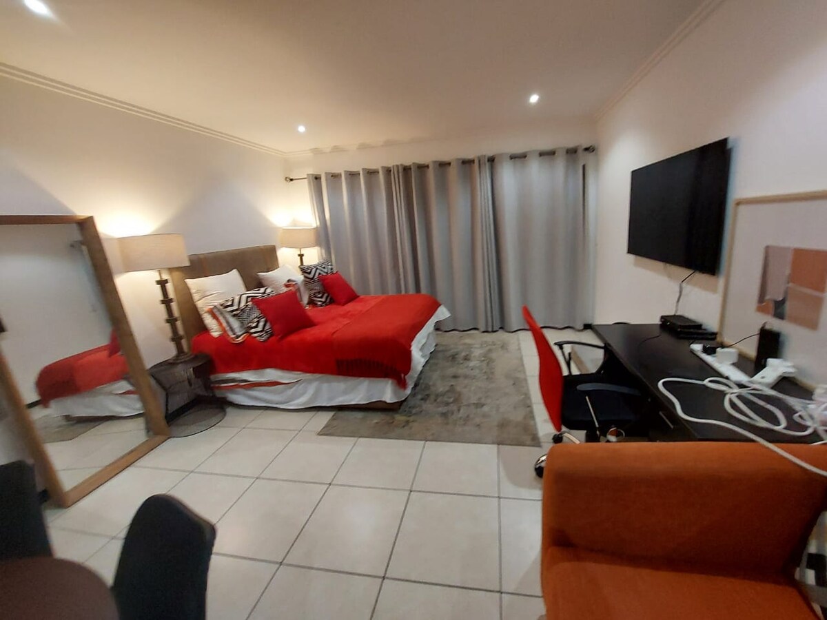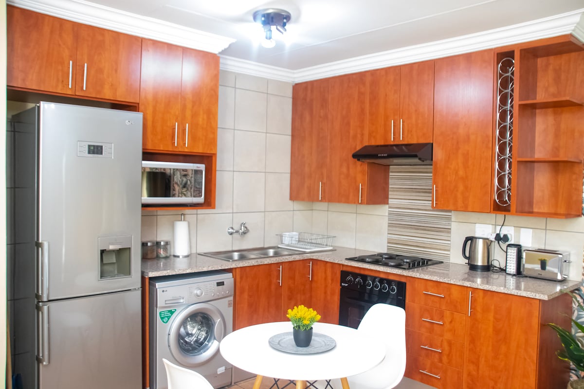 Stunning presidential suite, made for presidents and those who want to be royal for a few nights at affordable prices. 1 bedroom 1 bath apartment. Cozy, beautiful, luxurious, in a small boutique secure estate. Perfect for vacation, business, or a refreshing weekend getaway. Comfy bed. 1 Sofa Bed in the living room. Lovely kitchen with new appliances & decor. 65 inch HD Smart TV!! Washing machine. 12 minutes to OR Tambo airport. 6 minutes to Boksburg. 10 minutes to Bedfordview. Stunning beauty!