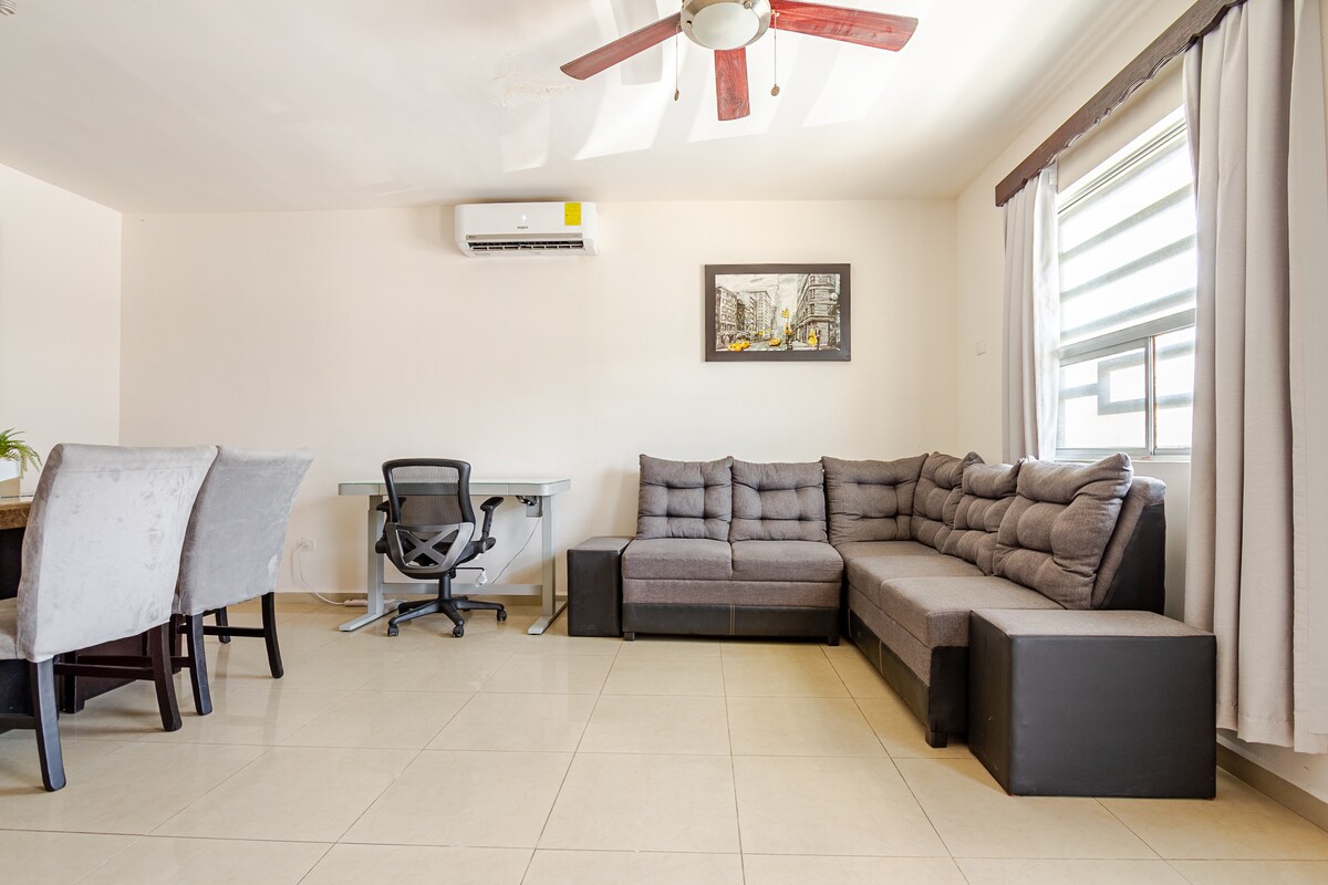 ✨ Viu Monterrey des de dalt 🌆 Relaxa't al nostre modern apartament de 2 habitacions i 2 banys a San Pedro amb unes impressionants vistes panoràmiques. Dues llits queen, 2 banys complets, cuina totalment equipada, aire condicionat, wifi ràpid, rentadora i assecadora, aparcament i seguretat 24/7. Perfecte per a viatges de negocis, mèdics o d'oci: a minuts dels millors hospitals, Showcenter, centres comercials i els millors restaurants. Ideal per a estades curtes o llargues, combina la comoditat de la llar amb l'experiència boutique que només San Pedro pot oferir.