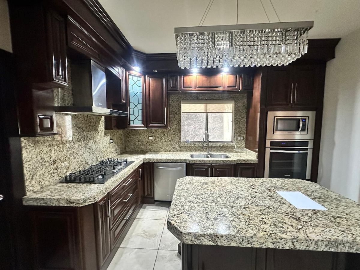 Diverteix-te amb tota la família en aquest allotjament elegant. Ambient agradable, molt segur, terrassa amb vistes a l'estadi Yaquis Entrada controlada, vigilància 24 hores, càmeres de seguretat, 2 televisors de 65" amb Netflix Prime, sistema de so a la terrassa i al jardí, aire condicionat i calefacció, mobiliari elegant i modern, bar amb taulell de granit, escala de fusta amb vidre temperat, cuina totalment equipada, cafetera Nespresso, bugaderia, pati, foguera i garatge cobert.