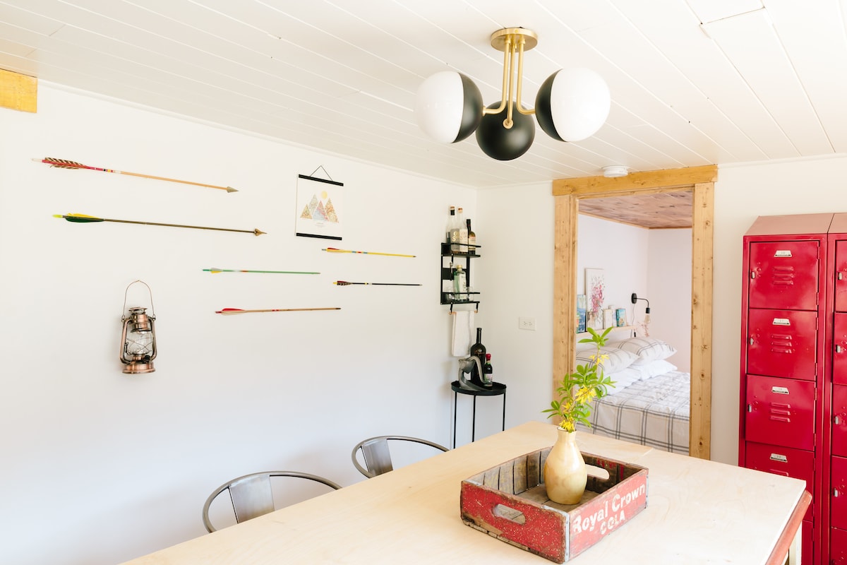 Aquesta caseta de 76 metres quadrats a la vora d'un rierol és perfecta per fer una escapada. Combina l'encant dels anys 50 amb les comoditats modernes: dos dormitoris amb llits «queen size», una cuina lluminosa i una sala d'estar relaxada. Gaudeix d'un matí tranquil al porxo del darrere o al pati al costat del rierol i xerra fins a la posta de sol. Després, camina 5 minuts fins al centre de Clayton per sopar, prendre unes copes artesanals i menjar postres. Després, relaxa't a la banyera d'hidromassatge sota les estrelles. A pocs minuts trobaràs camins, cascades, ràpids i vistes de la muntanya Black Rock.