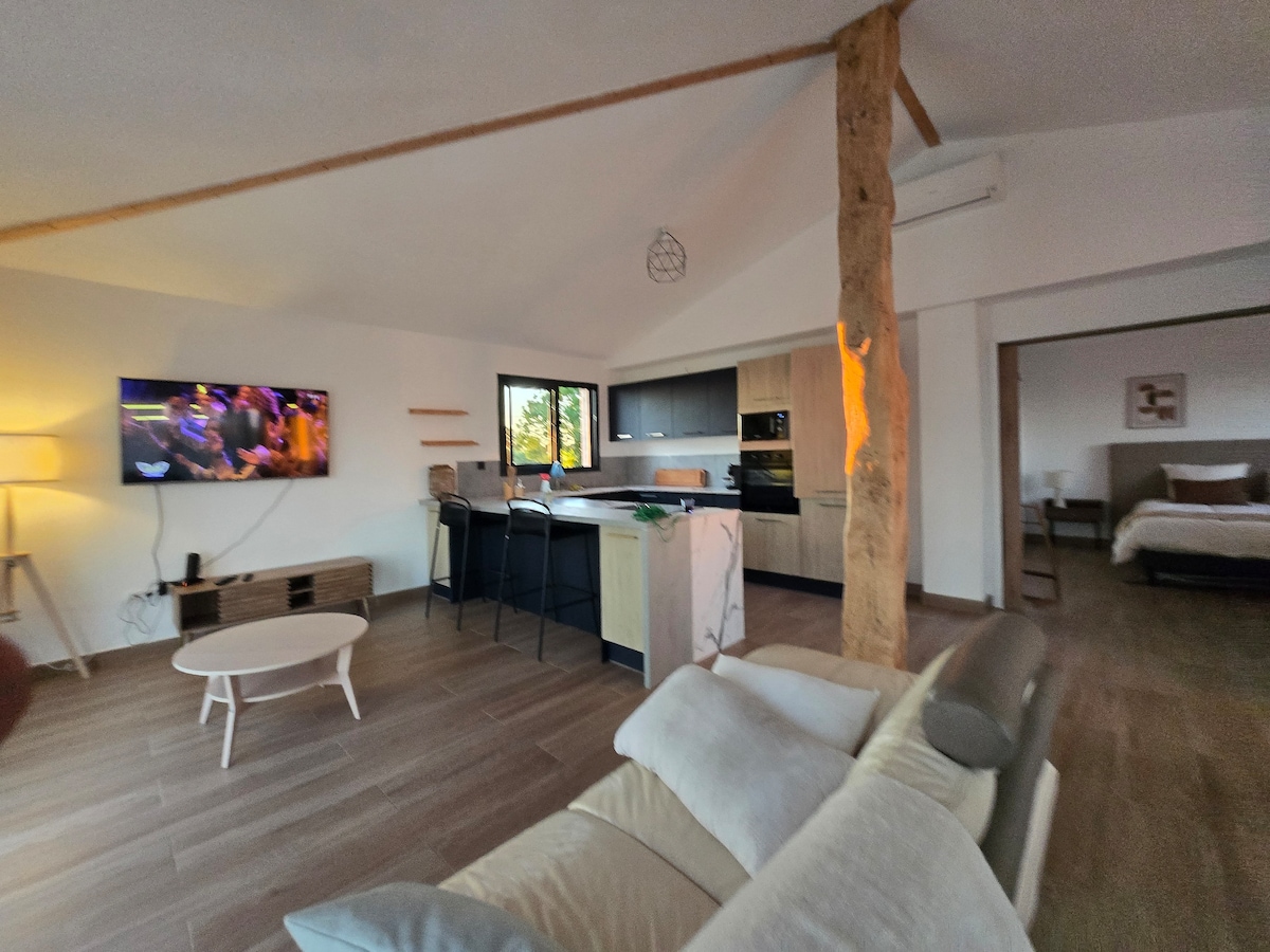 Oferim el nostre estudi independent, tant si vens a descobrir el Gers com per motius professionals. Aquest nou allotjament, amb totes les comoditats (cuina, aire condicionat) et permetrà gaudir d'una estada tranquil·la i plàcida. A la terrassa hi ha una taula. El sofà es pot convertir en un llit de matrimoni. Una anècdota divertida: t'hauries imaginat que aquest estudi abans era un contenidor? Tingues en compte que els exteriors estan en construcció.