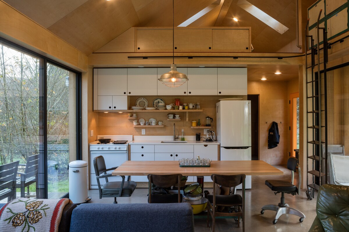 Beaver Creek Cabin is a modern cabin designed to bring the outdoors inside. It's 15 minutes from the beach, 20 minutes from Pacific City, Cape Lookout, and Tillamook, yet only 5 minutes from beer and cookies and pesto. Set on a 7 acre lot, it's remote enough to feel private, yet public enough to feel safe. Perfect for couples or families, amenities include modern convenience (dishwasher, wifi, roku) as well as the classics: sticks and stars and trails and trees.