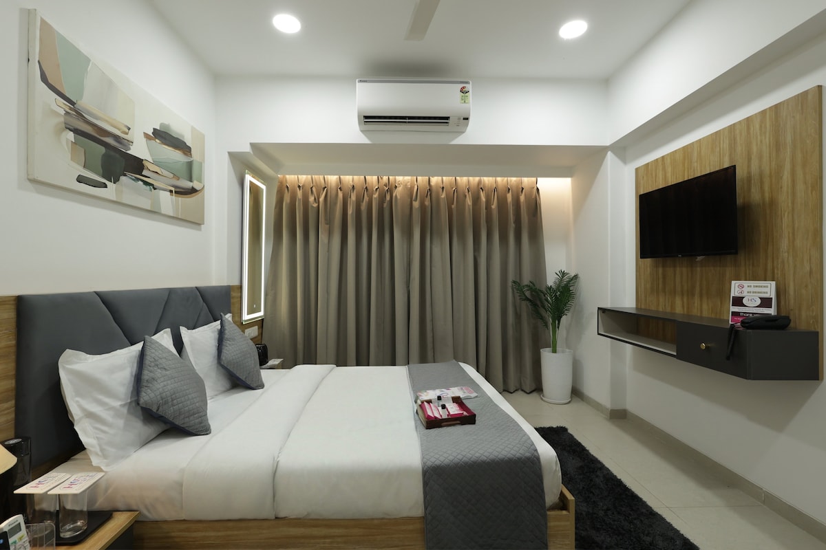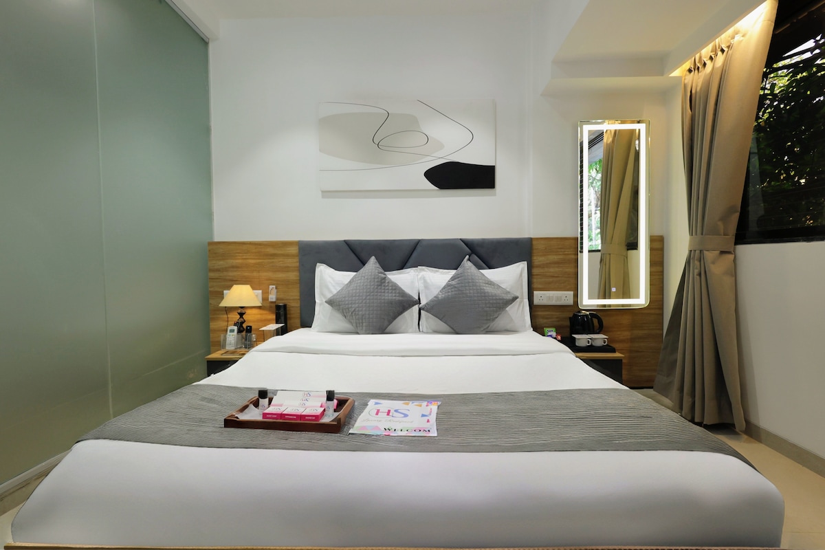 Welcome to our Premier Room in Chembur – the perfect choice for corporate guests seeking a luxurious and peaceful stay in Mumbai. This well-appointed room is designed with your comfort in mind, offering a serene ambiance where you can unwind after a busy day of work. Located in a quiet, upscale area, the Premier Room ensures a peaceful environment for both relaxation and productivity. It comes equipped with high-speed Wi-Fi, ideal for those needing to stay connected for work or meetings.
