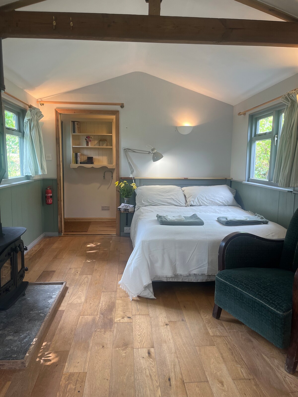 The Hutch Devon - Your home from home in Devon. Rest and recharge. Take in the wonderful views of the surrounding countryside from your own private deck. Sink into the king size bed, soak in the bath, and enjoy a meal for two by the fire or on the deck - depending on the season! Thoughtful extras include: breakfast, Nespresso, Netflix & fluffy bathrobes. 15 min drive to Exeter or Dartmoor. EV charging available. If unavailable, please see The Burrow at the same location with over 100 5* reviews.