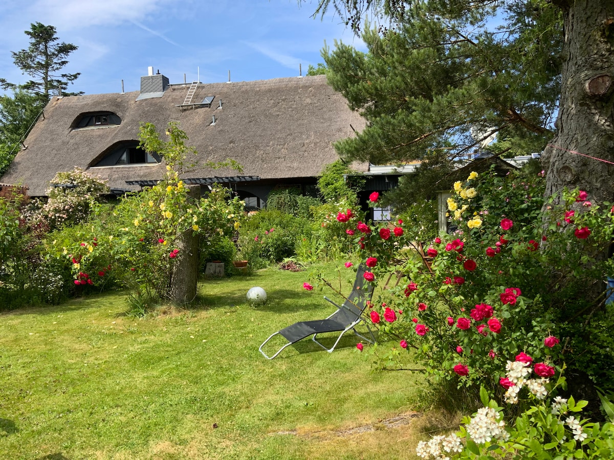 Haus Quitte - A house and garden with history for 8 adults and children. Travel back in time 250 years and let yourself be enchanted by an old thatched farmhouse, renovated to a high standard, surrounded by more than 8,000 m2 of paradisiacal garden with pool, pond and sauna. In the garden you will find many fruit trees to serve, special tree species, exotic roses and many cozy magical places to relax, linger, read and explore.