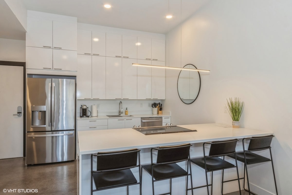 Market House #202 ofereix als hostes el luxe refinats de la vida urbana, situat al centre d'Iowa City. L'apartament núm. 202 presenta un disseny elegant i mobles de qualitat d'Ethan Allen. Aquest apartament de 2a planta ofereix un ampli dormitori/1 bany, un ampli espai habitable, una cuina completa amb un balcó privat. Aquest apartament està dissenyat meticulosament per prioritzar la simplicitat, el luxe i una estètica natural millorada. Amb sostres i finestres de més de 9 peus d'alçada, la llum natural impregna tots els espais.