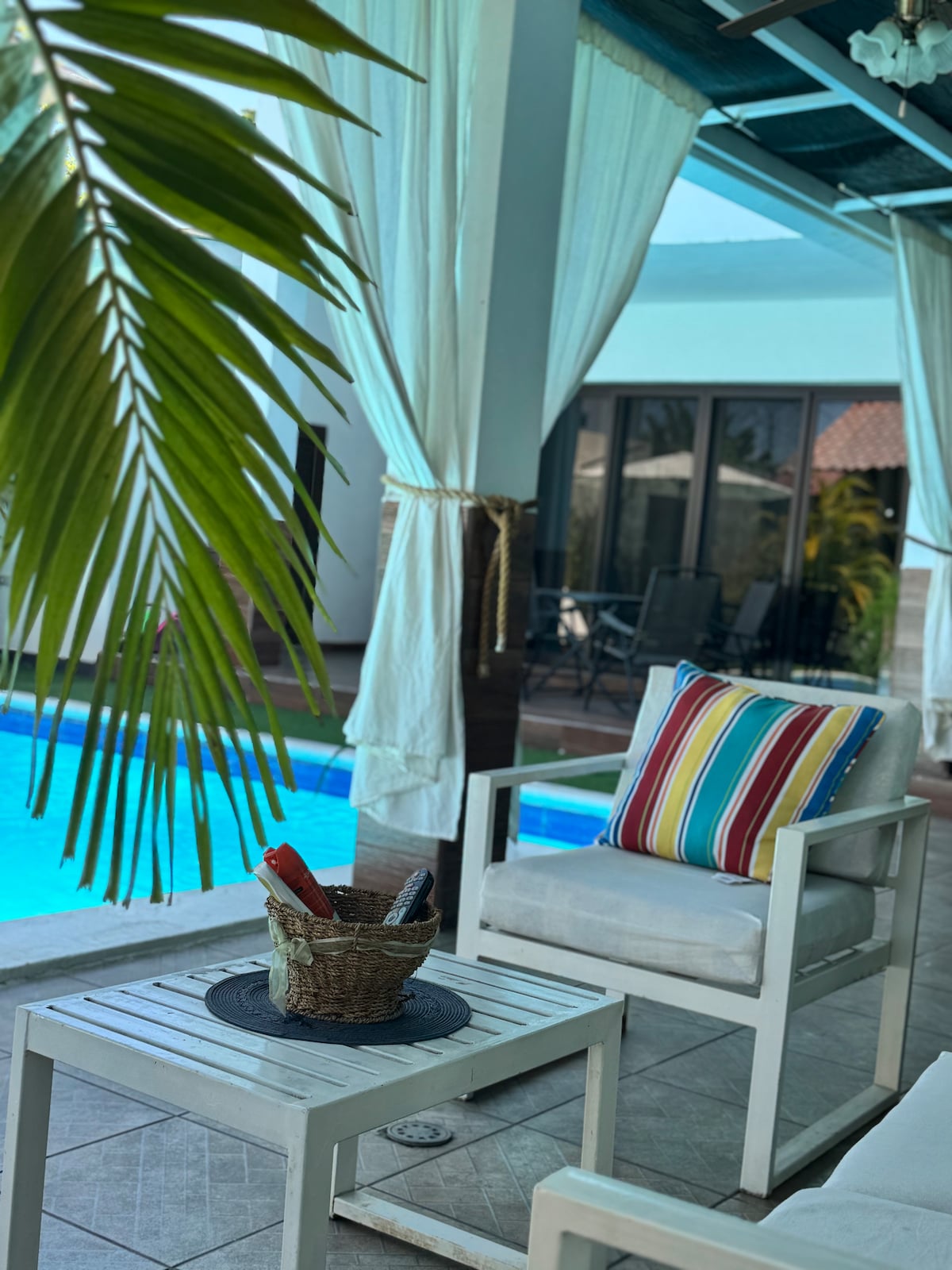 Palm House, amb piscina, davant del mar.