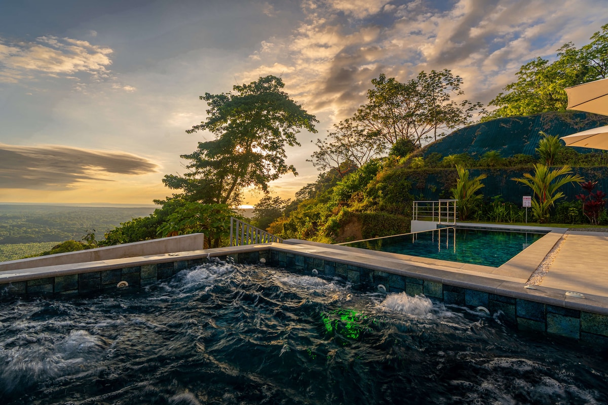 NOU ALLOTJAMENT DE LUXE Vistes panoràmiques de luxe de 360 graus Quatre suites Piscina infinita Arquitectura de luxe moderna Entorn privat i aïllat Una vil·la moderna i luxosa situada a dalt dels turons amb unes vistes panoràmiques de la selva tropical, les valls ondulades i l'oceà Pacífic a la distància. Les línies netes, els sostres alts i els vidres de terra a sostre creen espais oberts i lluminosos que flueixen directament cap a la terrassa i la piscina infinita, perfectes per relaxar-se i gaudir de postes de sol inoblidables.