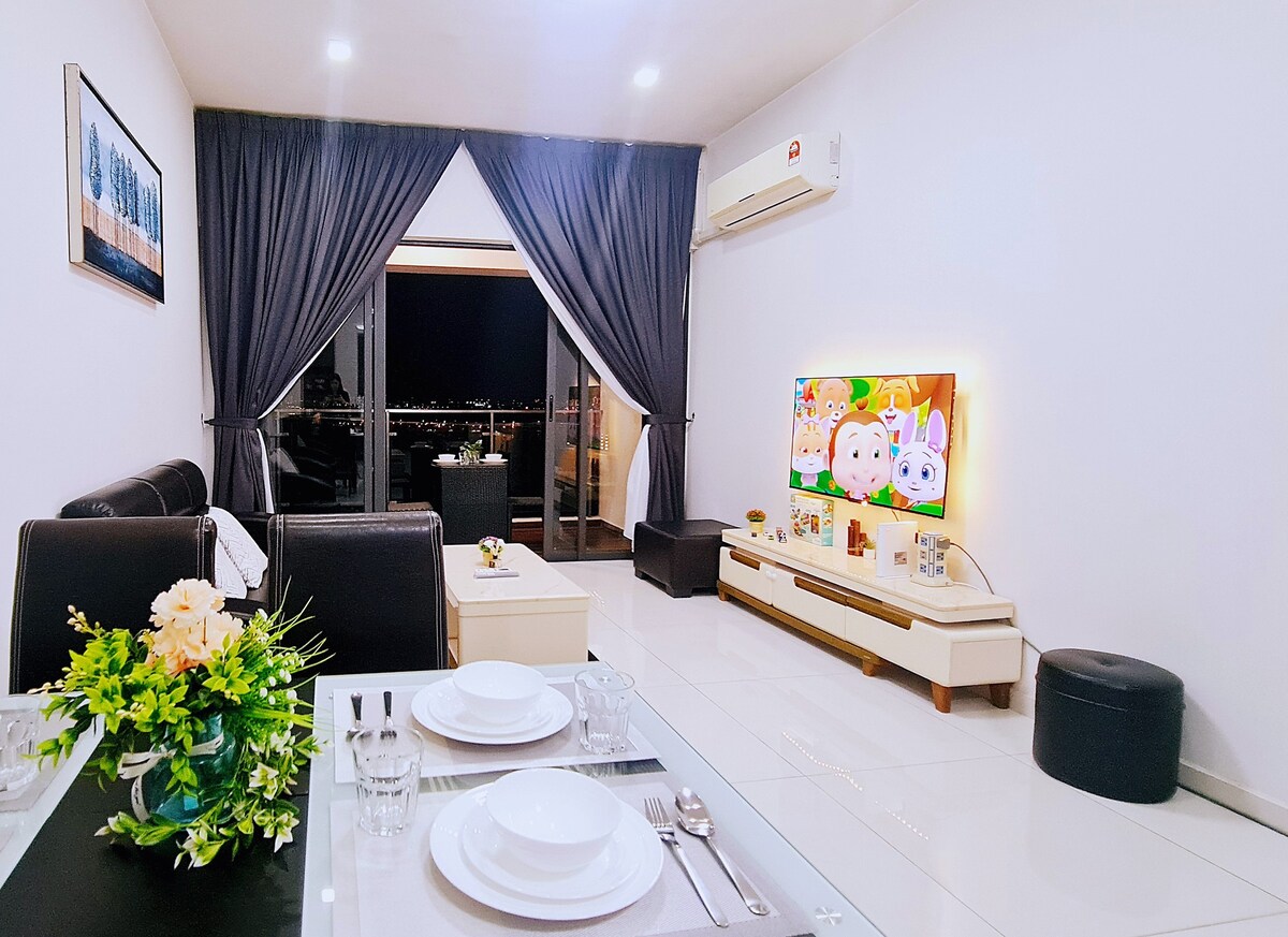 Stylish Seaview Stay @ Danga Bay, JB 2 bedrooms, both equipped with ultra-HD projectors and surround sound – a true private cinema. Master bedroom comes with bathtub and sea view. Cozy living room with fireplace and open kitchen. Facilities include swimming pool, gym and garden. Walking distance to mamak stalls, AEON, salons and shops. Only 10 mins to CIQ/Singapore, 15 mins to KSL and Paradigm Mall.