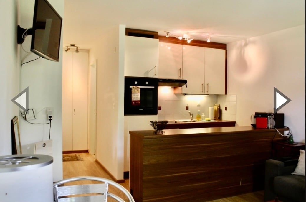 Estudi independent, d'estil industrial, totalment equipat i lluminós, amb terrassa de nivell amb vistes a una illa de verdor. Situat al centre de Crans, l'estudi té capacitat per a entre una i dues persones. L'accés al transport públic es troba molt a prop, des de Sierre o Sió. Possibilitat d'aparcament gratuït davant l'edifici. Caixa de seguretat davant la porta privada de l'estudi. Accés independent a l'estudi tant com sigui possible directament des del jardí.