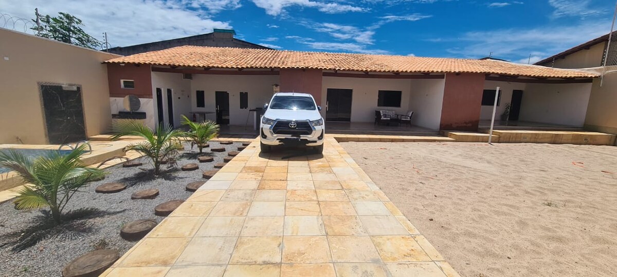 OBS: NÃO LOCAMOS PARA FESTAS/EVENTOS; PROIBIDO USO DE SOM. Espaço 20x40m, com sombras, piscina, deck com churrasqueira, cozinha. Armários, cooktop 5 bocas com botijão de gás instalado, dois garrafões de água mineral, bebedouro, 2 quartos com ar-condicionado, sendo um suíte, banheiro social (os dois com banho quente), alpendre com vários locais para colocar redes, geladeira. Quarto 1 (suíte): 1 cama casal, 1 cama solteiro. 1 rede; Quarto 2: 1 cama casal, 1 cama solteiro, 1 rede,