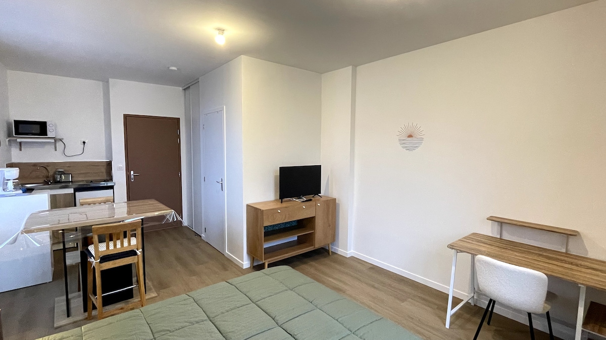 Et donem la benvinguda al nostre acollidor i optimitzat estudi. Ideal per a una estada de feina, sola o en parella. Cuina totalment equipada, bany amb dutxa, sala d'estar amb sofà llit, wifi i televisor. Les zones comunes estan disponibles per millorar la teva estada amb serveis d'accés gratuït (zona de jocs, zones exteriors) i amb reserva (cinema) Un entorn còmode que va més enllà d'un allotjament senzill, per gaudir d'una estada còmoda i agradable. Excel·lent ubicació a prop de l'equipament i els serveis