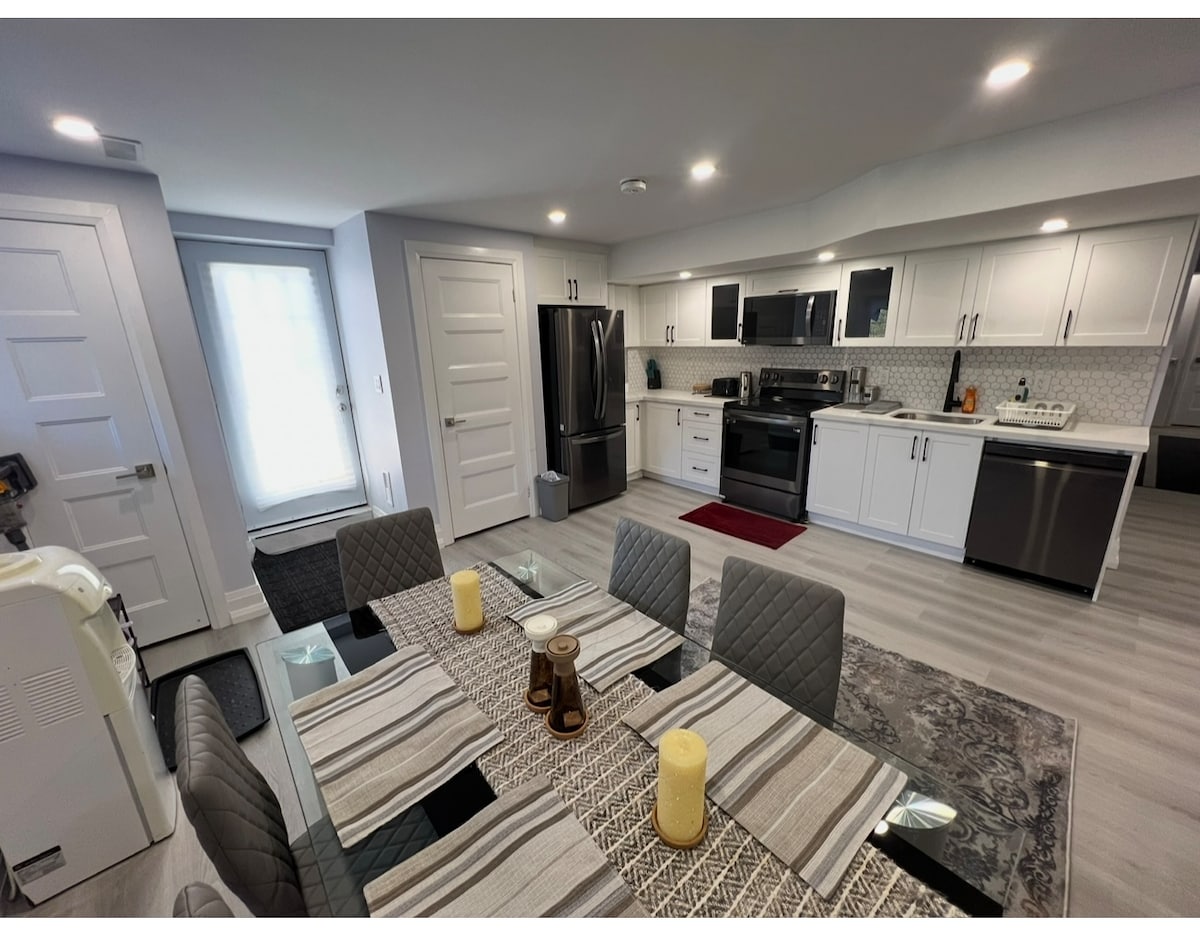 Enjoy your stay in this brand new, bright and modern 1-bedroom basement apartment, with a queen size bed , perfect for families, professionals, or tourists. The apartment features a cozy bedrooms, a fully equipped kitchen, a living room with comfy seating, dedicated dining area and large windows filling every room with natural light. The apartment is minutes away from local parks, shopping, restaurants, and quick highway access for exploring the GTA. No smoking, No pets or parties allowed.